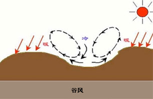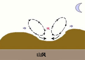 白天山坡受熱快,溫度高于山谷上方同高度的空氣溫度,坡地上的暖空氣從山坡流向谷地上方,谷地的空氣則沿著山坡向上補(bǔ)充流失的空氣,這時(shí)由山谷吹向山坡的風(fēng),稱(chēng)為谷風(fēng)。夜間,山坡因冷卻降溫速度比同高度的空氣快,冷空氣沿坡地向下流入山谷,稱(chēng)為山風(fēng)。